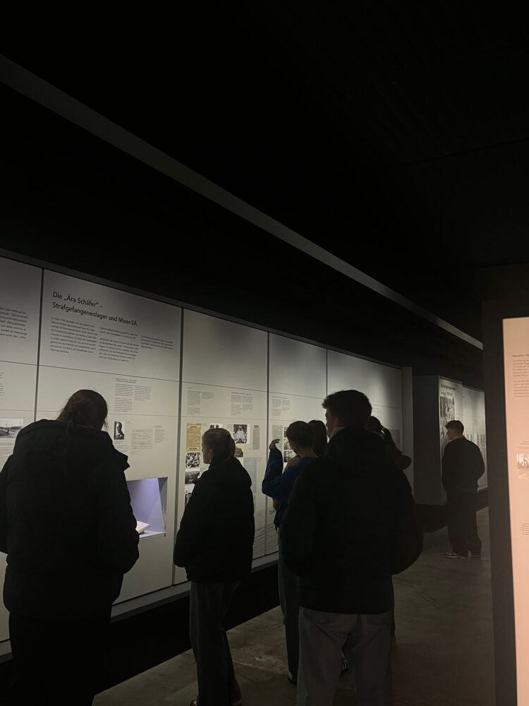 Der Museumsbesuch hinterließ bei vielen von uns einen nachhaltigen Eindruck. Zahlreiche Fotografien aus der Zeit des Nationalsozialismus verdeutlichten die menschenunwürdigen Lebensbedingungen der Häftlinge auf eindringliche Weise. Darüber hinaus waren originale Exponate wie Uniformen, Dokumente, Verträge und persönliche Gegenstände ausgestellt. Besonders eindrucksvoll war ein Zeitstrahl, der die Entwicklung der Konzentrationslager von ihrer Entstehung bis zur Befreiung nachzeichnete. Er machte historische Zusammenhänge anschaulich und vertiefte das im Unterricht erworbene Wissen. Viele von uns empfanden es als bewegend, wie unmittelbar die Geschichte an diesem Ort erfahrbar wurde.