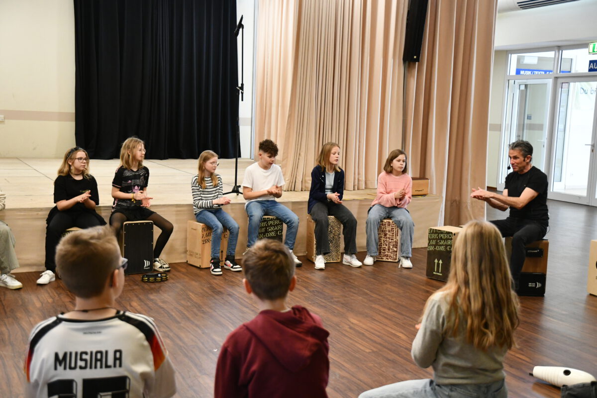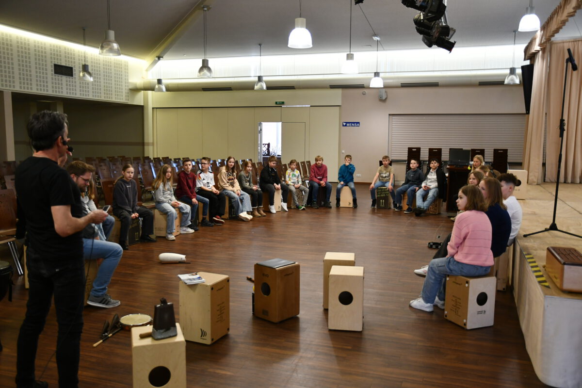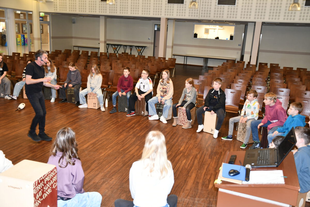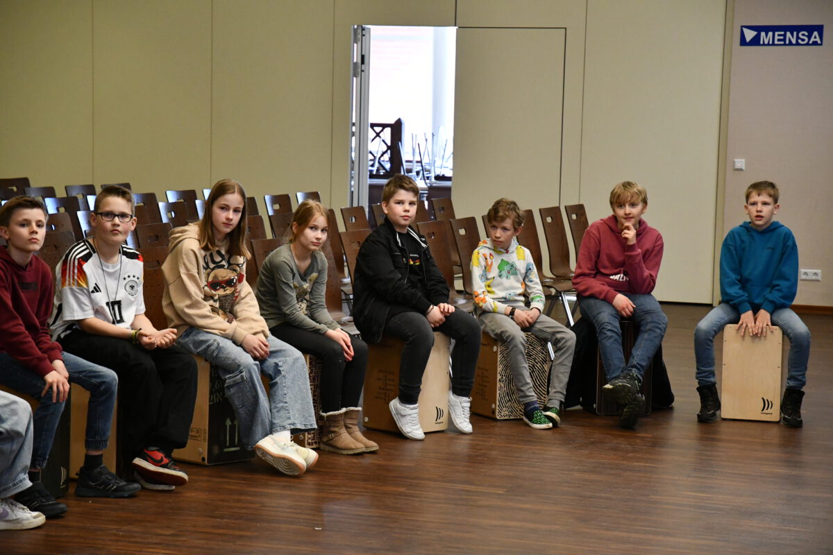 Was aussieht wie eine einfache Holzkiste, entpuppt sich schnell als echtes Klangwunder: Das Cajón ist ein vielseitiges Schlaginstrument, das mit den Händen gespielt wird und überraschend viele unterschiedliche Töne hervorbringt – von tiefen, warmen Klängen bis hin zu knackigen, hohen Akzenten. Von dem Angebot des spannenden Workshops am letzten Tag vor den Osterferien haben einige Schülerinnen und Schüler Gebrauch gemacht und konnten das besondere Instrument kennenlernen, ausprobieren und im gemeinsamen Spiel den Rhythmus spüren, der im Cajón steckt.