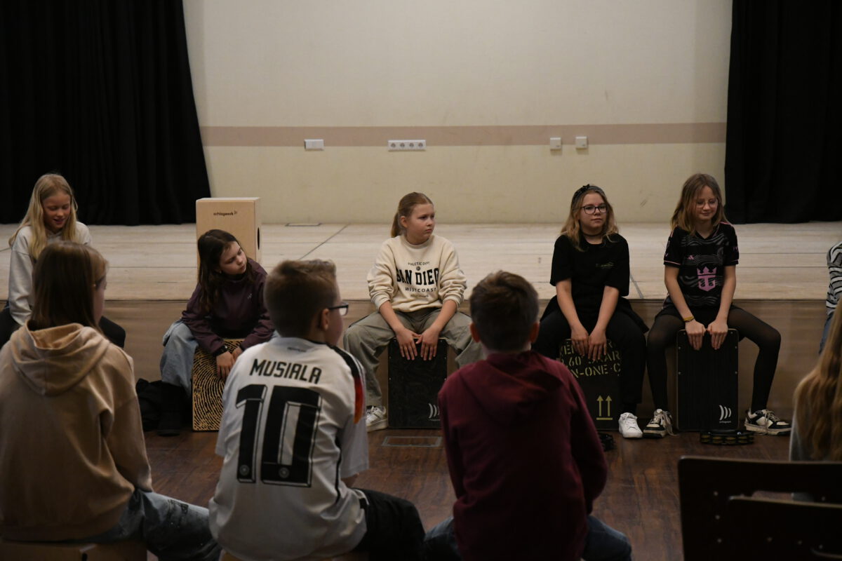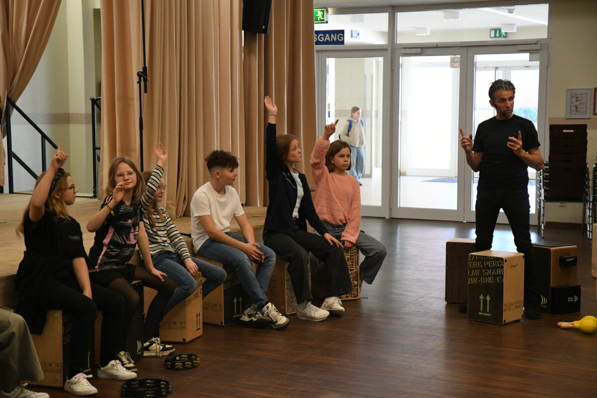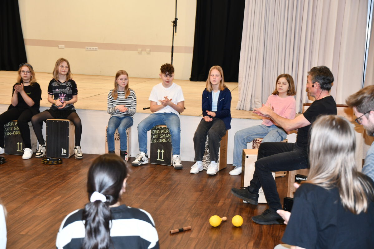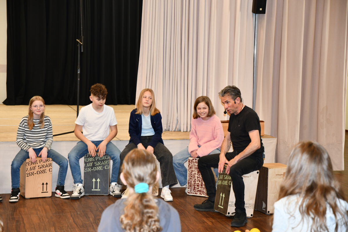 Was aussieht wie eine einfache Holzkiste, entpuppt sich schnell als echtes Klangwunder: Das Cajón ist ein vielseitiges Schlaginstrument, das mit den Händen gespielt wird und überraschend viele unterschiedliche Töne hervorbringt – von tiefen, warmen Klängen bis hin zu knackigen, hohen Akzenten. Von dem Angebot des spannenden Workshops am letzten Tag vor den Osterferien haben einige Schülerinnen und Schüler Gebrauch gemacht und konnten das besondere Instrument kennenlernen, ausprobieren und im gemeinsamen Spiel den Rhythmus spüren, der im Cajón steckt.