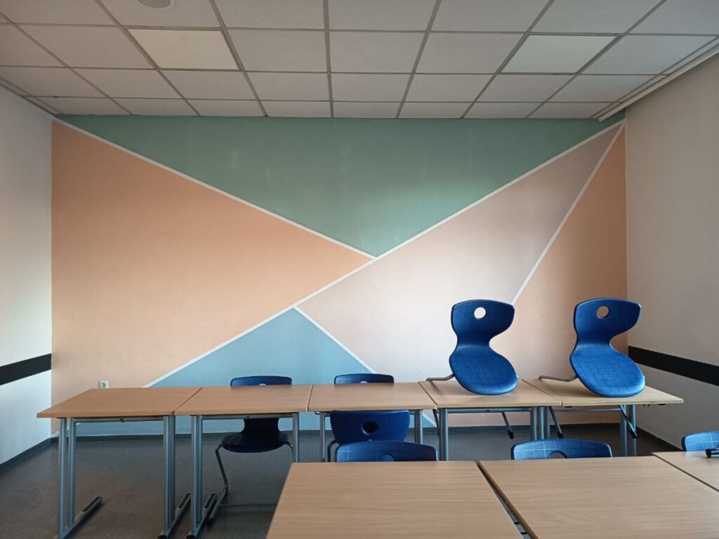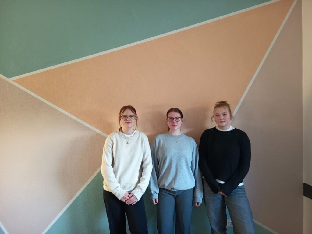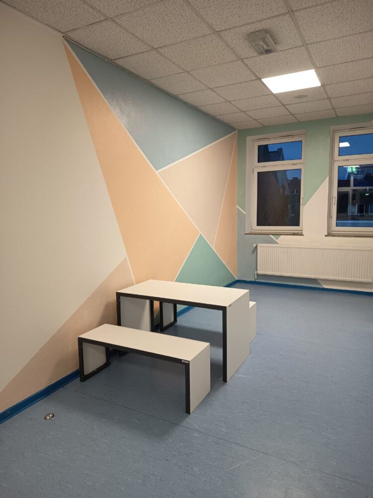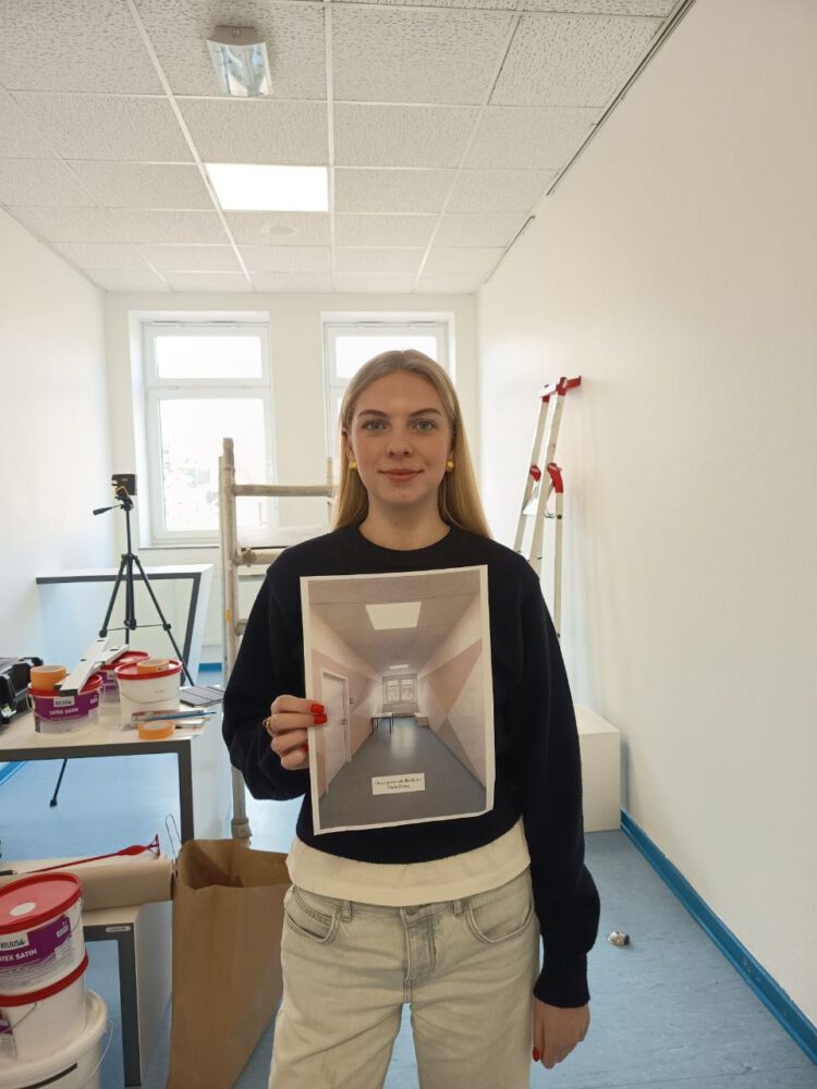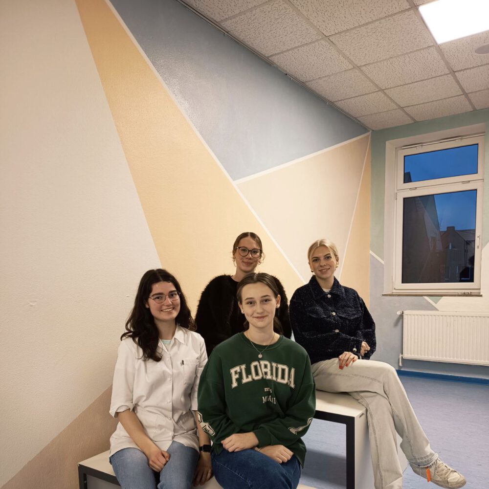Am 27.02. brachte Leni gemeinsam mit ihren drei Freundinnen Marieke Kamphuis, Fanny Andrees und Anna Wilmes das Gewinnerdesign an die Wände. Um 14:00 Uhr startete das Team mit Abkleben, Planungen und vielen kleinen Entscheidungen, die für ein gutes Ergebnis nötig waren. Nach rund zwei Stunden Vorarbeit konnten die Malerarbeiten beginnen – und bereits zwei Stunden später war das neue Wanddesign fertiggestellt und alles wieder aufgeräumt.