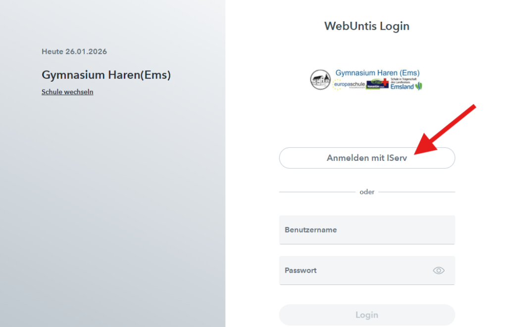 In WebUntis werden der tagesaktuelle Stundenplan der Schülerin/des Schülers inkl. der Vertretungen sowie die Hausaufgaben angezeigt. Die Anmeldung über einen Browser kann mit den IServ-Zugangsdaten der Schülerin/des Schülers erfolgen. Auf der Anmeldeseite muss dann der Button [Anmelden mit IServ] genutzt werden.